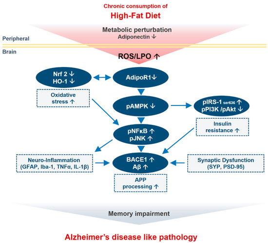 The majority of studies investigating variable diets, aging models, and behavioral analysis support the notion that exposure to HFD has a notable and long-lasting impact on learning and memory. The consumption of HFD accelerates cognitive dysfunction, neuronal insulin resistance, neuroinflammation, and loss of synapse density, leading to amyloid pathology in the brain. Herein, our results indicated that HFD induces biochemical or metabolic perturbations that elevated neuronal oxidative stress and brain insulin resistance through AdipoR1 suppression in HFD-fed mice. Notably, these findings are supported by our in vitro results, in which knockdown of AdipoR1 in an embryonic mouse hippocampal cell line mHippoE-14 leads to increased oxidative stress in neurons. Moreover, the chronic consumption of HFD leads from neuroinflammation to impaired memory function, synaptic loss through the AdipoR1/AMPK pathway by inhibiting IRS-1 at serine 616 and its downstream PI3-K/Akt pathway. Importantly, our data suggest that a loss of AMPK activation through AdipoR1 might constitute a potential mechanism through which cells develop neuronal insulin resistance, leading to a decline in cognitive function. Furthermore, our findings provide convincing evidence showing that HFD-induced metabolic dysfunctions lead to Aβ deposition and memory impairments through the adipoR1/AMPK/IRS1 axis, leading to the development of AD-like pathologies. Future pre-clinical efforts will be helpful for establishing the exact molecular mechanisms involving the effects of metabolic manipulations on the pathogenesis of neurodegeneration.