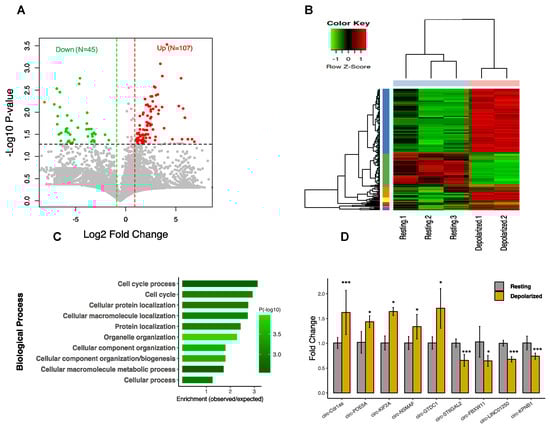 CircRNA transcripts are known for their capacity to fine-tune miRNA function through their activity as ceRNA [45]. To observe this influence, we analyzed the expression profiles of miRNA and mRNA in response to depolarization using RNA sequencing. After mapping and aligning read counts, we further identified 269 miRNAs with differential expression after depolarization (FDR < 0.05, FC > 1.5) compared to the resting state cells. This consisted of 130 upregulated and 139 downregulated miRNAs (Figure 3A and Table S3). Also, we observed 1511 mRNA transcripts to be differentially expressed (FDR < 0.05, FC > 2), including 557 displaying upregulation and 954 with downregulation (Figure 3B and Table S3). When considered in respect to the observed change in circRNA expression, this suggested there is a regulatory relationship between circRNA, miRNA, and mRNA in the molecular response to depolarization.