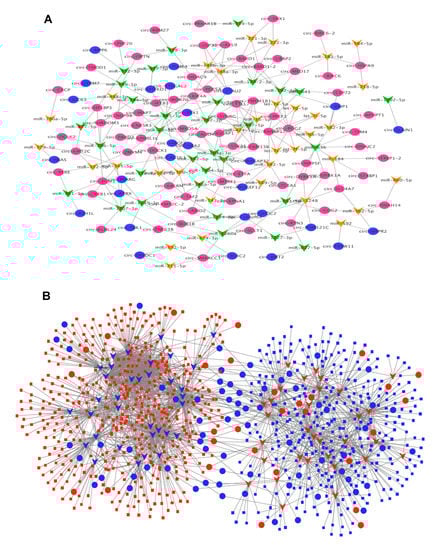 To predict miRNA binding sites within circRNAs, exon sequences of the circRNAs were extracted using hg19 annotation. Then, miRNA binding sites were identified using TargetScan_60 and targetscan_61_context_scores Perl scripts (http://www.targetscan.org/vert_71/) [35,36]. We used a context score threshold cutoff < −0.2 to obtain reliable interactions. We made the circRNA–miRNA interaction pairs for the DE circRNAs and the DE miRNA by predicting the miRNA targets, as mentioned earlier. We considered the circRNA–miRNA pairs regardless of the expression patterns between circRNAs and miRNAs with the assumption that the expression of circRNAs may not affect the expression of miRNAs in sponging condition. Then, we generated the miRNA–mRNA interaction pairs applying the same strategy; the DE mRNA and the DE miRNA were included, and the miRNA binding targets were predicted according to the above criteria. We only considered the pairs with inverse expression directions. The circRNAs–miRNA–mRNA network was generated by combining the circRNA–miRNA pairs and the miRNA–mRNA pairs such that the common miRNAs served as linker between the DE circRNAs and the DE mRNAs. For subnetwork analysis, we ranked the nodes by their network feature using 11 topological analysis methods and then selected the top nodes to make the network. We used CytoHubba plugin [37] in Cytoscape tool for this analysis. All the interaction networks were visualized using Cytoscape tool v.3.5.1 (http://www.cytoscape.org/) [38].