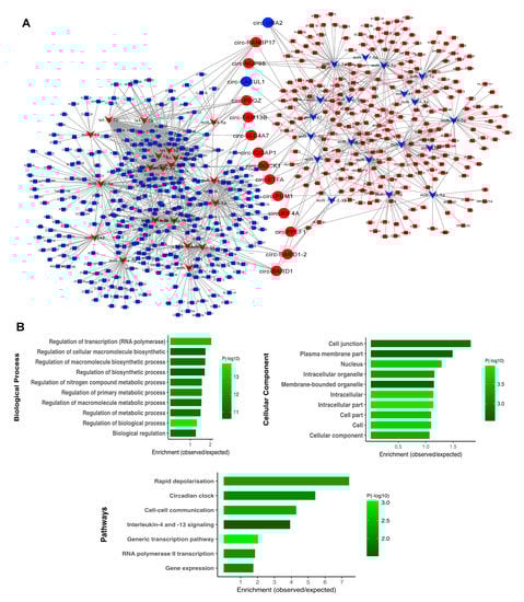 The subnetwork analysis and functional enrichment. (A) The top 15 highly ranked circRNA nodes from cytoHubba were used to construct the subnetwork consisting of 74 circRNA–miRNA and 1357 miRNA–mRNA pairs with 39 miRNAs and 572 mRNAs associated. The circle represents circRNA, the inverted triangle represents miRNA, and the rectangle represents mRNA. The red color denotes upregulation and blue denotes downregulation. (B) Functional enrichment analysis of the interacting mRNAs. The top significantly enriched GO terms and pathways are shown.