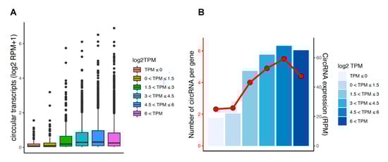 Relationship between the expression of circRNAs and their linear isoforms. (A) Comparison of the expression level of circular transcripts (RPM) with the linear transcripts (TPM) categorized by expression level. (B) Comparison of the expression level of host genes with the expression and the number of circRNAs per gene.