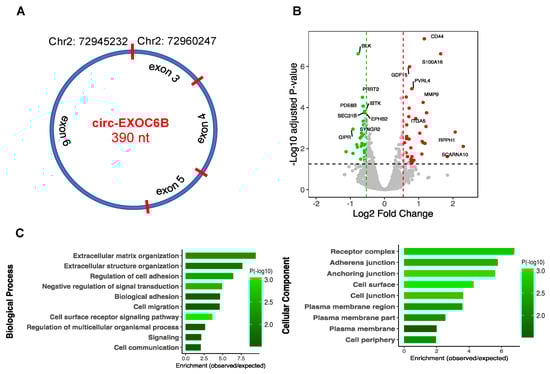 CircRNA circ-EXOC6B loss-of-function analysis. (A) The genomic features of circ-EXOC6B. (B) Volcano plot constructed using fold change values and adjusted p-values (FDR) to compare the gene expression changes between the control and the knockdown conditions. Red dots represent significantly upregulated genes and green dots represent downregulated genes, with the vertical lines corresponding to 1.5-fold change and the horizontal line representing an FDR cut off < 0.05. (C) Functional enrichment analysis of the DE genes. The top significantly enriched GO terms are shown.