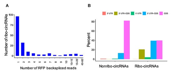 Analysis of ribosome-associated circRNAs. (A) The number of ribosome-associated circRNAs (ribo-circRNAs) and their back-spliced reads detected in ribosome profiling. (B) Annotation of the ribo-circRNAs and their comparison with nonribo (non-translated) circRNAs from RNAseq.