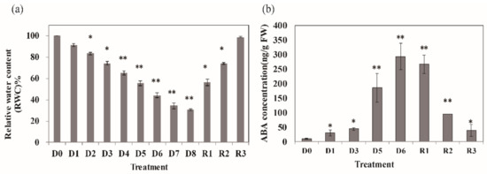 To examine the physiological changes of N. benthamiana plants in response to drought stress, 40 day-old N. benthamiana plants were subjected to drought stress, and their relative water content (RWC), and phytohormone were determined. The RWC significantly decreased after more than 4 day drought treatment (p ≤ 0.01). After an 8 day drought treatment (denoted by D0–D8), the RWC had decreased to 70% (Figure 1a). After the 8 day drought treatment, plants were re-watered for two days (R1: re-watered for 8 h; R2: re-watered for 24 h; R3: re-watered for 48 h). There are no obvious leaf senescence and degradation of chlorophyll during the stress treatment according to the physiology parameters (Figure S2).