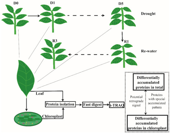 Treatment and analysis work flow.Drought and re-watering treatment were imposed on N. benthamiana seedlings; D0 (no-drought), D1 (first day of drought), D5 (fifth day of drought), R1 (8 h of re-watering) and R3 (48 h of re-watering) samples were used for protein isolation, fast-digest, iTRAQ and further analysis.