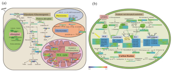As Figure 4b shows, most enzymes for carbon fixation, photosynthesis, porphyrin, and chlorophyll metabolism, and carotenoid biosynthesis were also significantly induced by drought stress, especially in chloroplasts.