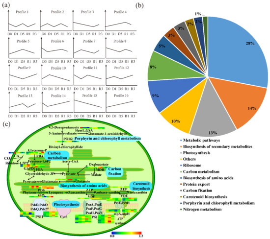 To further profile the differentially abundant proteins in leaves and chloroplasts induced by the drought treatment, the proteins were classified based on their accumulation patterns. A total of 3936 TPs and 1087 CPs were grouped into 16 profiles, respectively. The TPs with differential accumulation patterns were divided into two major groups (Figure 5). TPs in profiles 4, 5, 10, and 16 were increased in leaf cytosol under drought stress; however, the total amounts of proteins in profiles 10, 5 and 4 were reduced at D5, R1, and R3, respectively. Therefore, we termed this group of TPs “up-down TPs”. TPs in profiles 3, 9, 14, and 15 were first decreased at earlier stages of drought stress, but proteins in profiles 14, 9, and 3 increased at D5, R1, and R3, respectively. We termed this group of proteins as “down-up TPs”. Some of the accumulation patterns were complex. For example, proteins in profiles 7, 12, and 13 were induced by drought, followed by a reduction at R1, D5, and R1, but were elevated again at R3, respectively. Similar results were also observed in profiles 6, 11, and 8 with an initial reduction at the earlier stages of drought stress treatment, followed by an increase at D5, D5, and R1, then a second reduction at R3, R1, and R3, respectively. Other protein accumulation patterns were even more complicated. The accumulation patterns of proteins in profiles 2 and 1 had a reverse trend in each test. The proteins in profile 2 increased at D1, decreased at D5, increased at R1 and decreased at R3, while the dynamic pattern of proteins in profile 1 was the opposite. We found that 881 TPs were strongly induced by drought stress, and 772 of them were down-up TPs (Figure 5a). This dynamic of TPs is consistent with the first treatment of drought followed by a re-watering treatment.