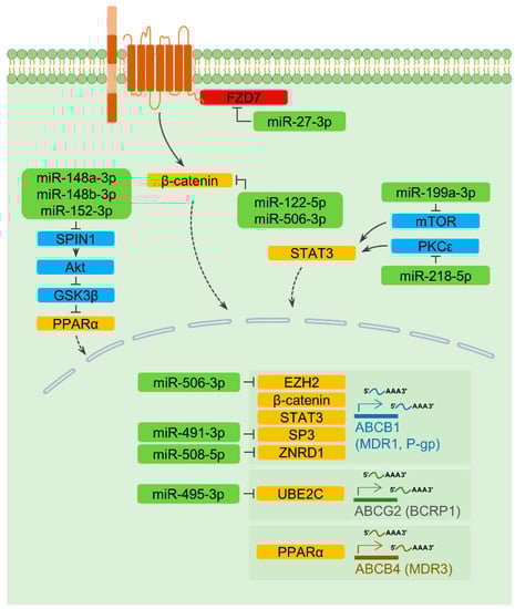 There is a possibility that the expression of transporters is transcriptionally regulated in an miRNA-dependent way. Wnt/β-catenin is one of the signaling pathways regulating the transcription of ABCB1 and causes multidrug resistance in cancers []. Frizzled 7 (FZD7), a receptor for Wnt ligands, has been identified as an miR-27-3p target. Ectopic introduction of miR-27-3p down-regulates ABCB1 and augments 5-fluorouracil-induced cell death []. Recent studies also confirmed that miR-122-5p and miR-506-3p could elevate drug-induced cell death in hepatocellular carcinoma and colorectal cancer cells, respectively, by negatively regulating β-catenin and ABCB1 levels [,]. There is another possibility that miR-506-3p regulates ABCB1 expression by targeting the enhancer of zeste homolog 2 (EZH2), which is a possible transcription regulator of ABCB1 [,]. In addition, a decrease in ABCB1 expression can be mediated by miR-199a-3p and miR-218-5p via regulating mTOR and protein kinase C epsilon (PRKCE, also known as PKCε), respectively [,]. Since both mTOR and PKCε activate the signal transducer and activator of transcription 3 (STAT3), a transcription factor of ABCB1 [,,], it is feasible that miR-199a-3p and miR-218-5p could down-regulate ABCB1 levels through a common mediator. As noted above, miR-491-3p directly controls ABCB1 expression. Interestingly, miR-491-3p also transcriptionally represses ABCB1 levels by regulating Sp3, which is known as a transcription factor of ABCB1 []. In addition, it was intriguingly noted that miR-508-5p, which directly regulates ABCB1, also targets zinc ribbon domain-containing 1 (ZNRD1), thereby negatively regulates the transcription of ABCB1 [,] (Figure 1 and Table 1).
