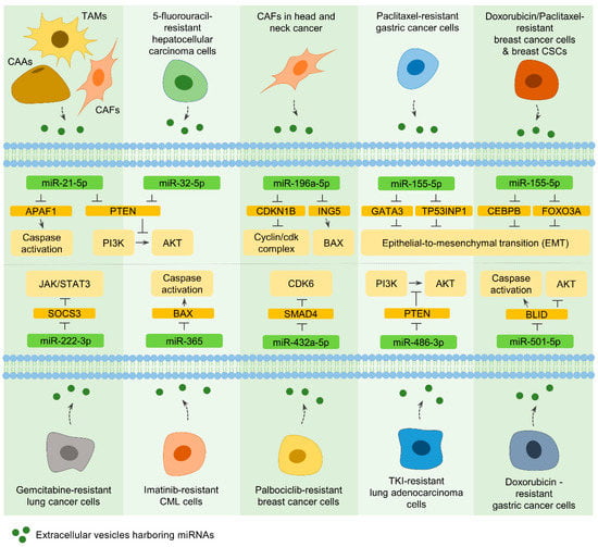 There are other factors responsible for cancer therapeutic resistance. Cancer stem cells (CSCs) are known to be resistant to cancer treatments due to several features, such as self-renewal potential, activation of the DNA damage response, and high levels of drug transporter []. Autophagy is also known to support the properties of CSCs [,]. Additionally, epithelial–mesenchymal transition (EMT) has been revealed to confer the ability to acquire CSC properties onto cancer cells, thereby contributing to therapeutic resistance []. Moreover, cell-to-cell communication via extracellular vesicles among different types of cells within the cancer microenvironment could affect the efficacy of cancer therapies by delivering miRNAs that regulate various signaling pathways connected to therapeutic resistance [,].