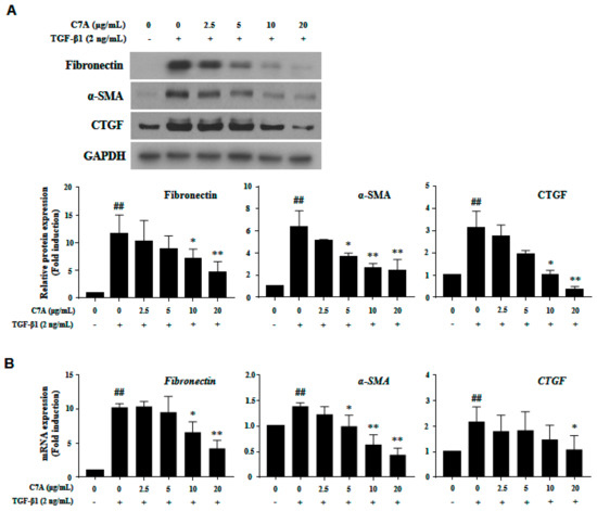 To explore the further effects of C7A on HSC activation, the protein and mRNA expressions of fibronectin, α-smooth muscle actin (α-SMA), and connective tissue growth factor (CTGF), which are hallmarks of HSC activation, were analyzed. As shown in Figure 4A, C7A significantly suppressed fibronectin, α-SMA, and CTGF protein expressions that were induced by TGF-β1 treatment. Moreover, the mRNA expression level of fibronectin, α-SMA, and CTGF were also decreased in a dose-dependent manner by C7A treatment (Figure 4B).