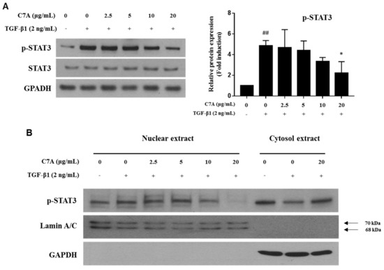 STAT3 is an important transcription factor to control cell proliferation and apoptosis of HSCs [13,17]. In response to various growth factors and cytokines, JAK-mediated phosphorylation at tyrosine induces the STAT3 monomer to a heterodimer and translocates to the nucleus, which can activate downstream of STAT3 signaling pathway, including matrix metalloproteinases (MMPs) and connective tissue growth factor (CTGF) [54,55]. These overall procedures of STAT3 activation are responsible for ECM deposition, migration, and apoptosis in HSC and diverse liver disease. Not only inflammatory cytokines like interlukin-6, but TGF-β1 also can activate STAT3 both directly through JAK1 stimulation and indirectly through the SMAD3 pathway [11,56]. In our results, TGF-β1 significantly increased STAT3 phosphorylation and p-STAT3 translocation to the nucleus. Moreover, TGF-β1 increased the expressions of MMP-2, MMP-9, TIMP-2, and CTGF, which are downstream of the STAT3 signaling pathway. We showed that C7A significantly suppressed TGF-β1-induced STAT3 phosphorylation.