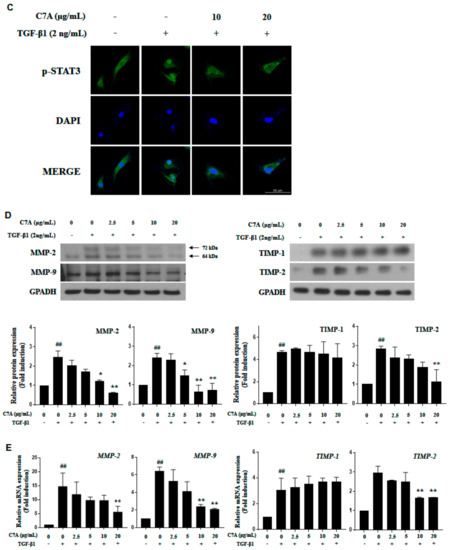 The STAT3 pathway plays a critical role in hepatic fibrosis by regulating proliferation and activation of HSCs; therefore, inhibition of STAT3 has been considered as an important therapeutic target for hepatic fibrosis [14,15]. In this study, we found that C7A significantly inhibited TGF-β1-induced STAT3 phosphorylation (Figure 5A). To identify the mechanism of C7A on STAT3 inhibition, the p-STAT3 level in the nuclear fraction was analyzed. Translocation of p-STAT3 to the nucleus was induced by TGF-β1 treatment; however, C7A suppressed p-STAT3 translocation in a dose-dependent manner (Figure 5B). Nuclear translocation of p-STAT3 by TGF-β1 treatment was also observed by immunofluorescence assay, and it was blocked by C7A treatment (Figure 5C). Matrix metalloproteinase (MMP-2 and MMP-9) and tissue inhibitors of metalloproteinase (TIMP-1 and TIMP-2) are involved in cell migration and proliferation of activated HSCs. MMPs and TIMPs are known to be downstream genes of the STAT3 pathway and regulated by STAT3 activation [39,40]. TIMPs are associated with the regulation of MMP activities, and particularly, TIMP-1 and TIMP-2 are reported to be highly expressed in human liver fibrosis [41,42,43]. As regulators of MMPs, TIMP-1 can form a complex with pro-MMP-9, while both TIMP-2 and TIMP-4 can bind to the pro-MMP-2 [44,45]. To explore the effects on STAT3 inhibition by C7A, protein expressions of MMP-2, MMP-9, TIMP-1, and TIMP-2 were measured. As a result of C7A treatment in activated HSCs, C7A significantly down-regulated the protein expressions of MMP-2, MMP-9, and TIMP-2, but not TIMP-1 (Figure 5D). In addition, the mRNA expression levels of MMP-2, MMP-9, and TIMP-2 were also significantly decreased by C7A treatment, but not TIMP-1 (Figure 5E).