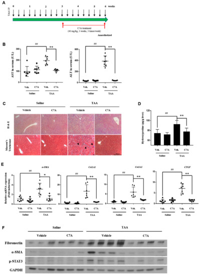 All animal experiments were approved by the Sungkyunkwan University Animal Care Committee and conducted in accordance with the guidelines of the National Institutes of Health (SKKUIACUC2018-10-44-2). Male C57BL/6 mice (6 weeks old; 22–25 g) were purchased from Daehan BioLink (Chungbuk, Korea). Water and food were provided ad libitum. After a week of acclimatization, mice were randomly divided into four groups: (1) mice received vehicle (saline) and vehicle (saline), (2) mice received C7A and saline, (3) mice received saline and thioacetamide (TAA), and (4) mice received C7A and TAA. Mice were treated with TAA (150 mg/kg) through intraperitoneal injection (I.P.) three times per week for 6 weeks. On day 22, mice were treated with saline or C7A (40 mg/kg) through I.P. injection three times per week for 3 weeks. Mice were anaesthetized on day 43, and blood and liver tissue samples were collected for analysis.