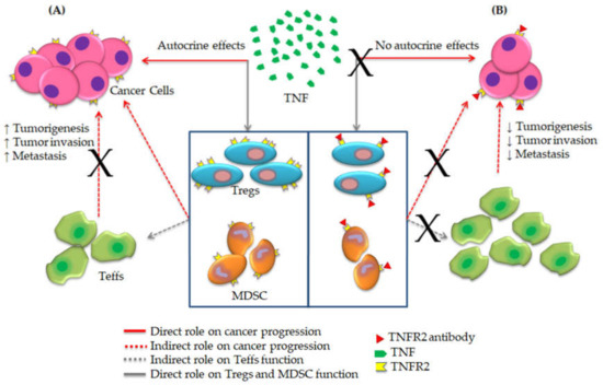 Tumor necrosis factor (TNF) was first described in the early 1960s as its originally discovered role during tumor regression in rodents [1]. After its initial discovery, many research groups have studied the implications of TNF interactions with its receptors 1 and 2 (TNFR1 and TNFR2) in various inflammatory conditions [2,3]. As inflammation plays a key role in cancer progression and the microenvironment of cancer is controlled by inflammatory cells [4], previous studies have explored TNF-TNFRs interactions in cancer proliferation, metastasis and immune evasion [5]. These studies concluded that TNF works as a tumor-suppressive cytokine through interaction with TNFR1, which is expressed on both normal and tumor cells [6,7,8]. In contrast, TNFR2 expression was only reported on tumor cells and suppressive immune cells, suggesting that TNFR2 directly promotes cancer development [9]. Furthermore, the latest preclinical and clinical studies confirmed the implication of TNF-TNFR2 signaling in cancer proliferation and the suppression of immune response [10,11]. Consequently, blockade of TNF-TNFR2 axis could be a promising option for cancer treatment (Figure 1).