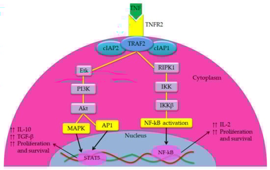 When TNF-TNFR2 axis is activated, the intracellular domains activate the complexes consisting of TNF receptor-associated factor-2 (TRAF-2), cellular inhibitor of apoptosis protein-1 (cIAP-1) and cIAP2 resulting in the initiation of canonical and non-canonical activation of three main pathways, including NF-kB, activator protein 1 (AP1) and mitogen-activated protein kinases (MAPK) pathways [29,30]. The activity of these pathways both in cancer cells and immunosuppressive cells has led to the conclusion that TNFR2 contributes to cancer progression, expansion as well as stability of Tregs [16]. These pathways activate the phosphoinositide 3-kinases/protein Kinase B pathway (PI3K/Akt) signal transduction pathway that promotes survival and growth [31,32]. Further, NF-kB pathway promotes the transcription of genes responsible to cell proliferation and survival [33]. Activation of PI3K/Akt pathway reduces the differentiation of T helper 17 cells (Th17), which is associated with increased phosphorylation of signal transducer and activator of transcription 5 (STAT5) [33]. The STAT5 got a critical role in the function and activation of Tregs and it is associated with suppression of the anti-tumor activity of Teffs and an increase in proliferation, survival and immune invasion of cancer cells [34]. The suppressor mechanism of STAT5 is based on enhancing the secretion of interleukin-10 (IL-10) and transforming growth factor-β (TGF-β) [35]. NF-kB also leads to increased IL-2 expressions via activating its promoter, which enhances expansion and stability of Tregs that expressing abundant amounts of the IL-2 receptor (IL-2R) associated with improving their suppressor function [36]. The overall description of the implication of TNFR2 activation in cancer cells progression and promoting immunosuppressive cells is summarized in Figure 2 [29,33,37,38].