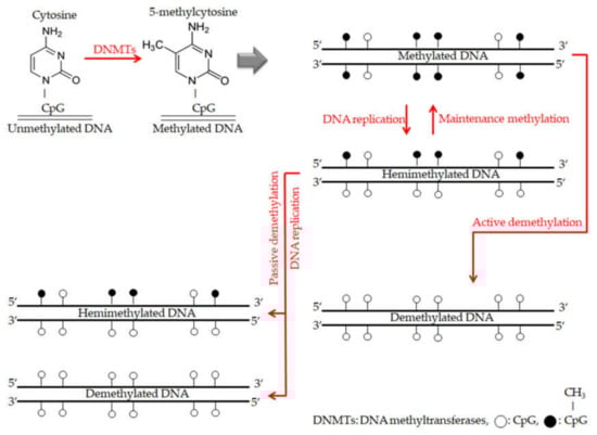 The overall description for mechanisms of DNA methylation and demethylation. During DNA methylation, DNA methyltransferases (DNMTs) enzymes are responsible for adding methyl groups to specific CpG islands and establishing DNA methylation patterns. With each DNA replication round, there is a new strand of unmethylated DNA. Thus the new double strand DNA becomes hemimethylated. Furthermore, maintenance methylation process by DNMT1 enzyme leads to copy that DNA methylation pattern from the old strand onto the new strand. On the other hand, during DNA demethylation, maintenance methylation process finishing with remarkably failing, which leads to stopping DNA methylation patterns (passive demethylation). While, active demethylation achieving by specific enzymes have not been explicitly explored and results in modifying methylated cytosines to only cytosines without methyl groups and independently of DNA replication [75].