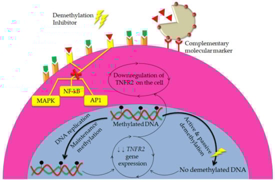Besides immunotherapy, the use of epigenetic modifications to influence the differentiation of programmed lineage pathways within the immune system has also emerged a few years ago [17]. For example, the inability to differentiate between Tregs and activated T cells neither through FOXP3 mRNA nor protein detection has made it difficult to study these cell subsets in the context of various diseases. To bypass this problem, previous studies have used DNA demethylation within the FOXP3 gene, to specifically identify Tregs in human peripheral tissue. Since FOXP3 is an essential marker for CD4+ Tregs and its expression plays a vital role in controlling the transcriptional program of Tregs, this approach could provide us valuable insight in understanding the molecular features of Tregs in healthy and disease states [18,19]. In other diseases like inflammatory bowel disease, gene expression profile was reported to be related to downregulation of TNFR2, thus promoting CD8+ T cell role in these types of inflammatory responses [20].