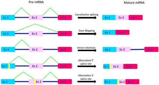 Alternative isoforms could originate from distinct mechanisms such as exon-skipping or intron-retention promoting, respectively, exon exclusion or intron inclusion into the mature mRNA. Moreover, sometimes spliceosome might ignore the constitutive splice site, preferring alternative ones located in the exon or intron sequences. Therefore, a piece of exon could be lost or intronic regions could be included [25] (Figure 2).