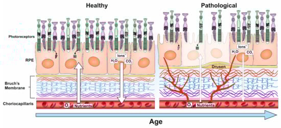 Structural changes to tissues in the outer retina during aging and disease. The retinal pigment epithelium (RPE) carries out activities that are critical to maintaining photoreceptors. The RPE monolayer is supported by a thin tissue called Bruch’s membrane (BrM), which collectively demarcates the blood–retinal barrier. The choriocapillaris provides oxygen and nutrients whilst removing high levels of metabolic waste that are generated in the outer retina. Thickening of the BrM occurs as a natural part of aging. However, changes including the accumulation of sub-RPE protein/lipid deposits referred to as drusen as well as alterations to its biophysical properties are linked with retinopathies such as age-related macular degeneration and Sorsby fundus dystrophy. Late stages of these diseases are associated with the atrophy of RPE cells and blindness due to photoreceptor loss; a phenotype referred to as geographic atrophy. An alternative terminal phenotype, termed choroidal neovascularisation, is characterised by the presence of nascent, leaky capillaries which penetrate the BrM to cause retinal detachment.