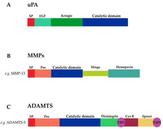 Schematic representation of proteinases involved in OA. (A) the serine proteinase uPA contains an N-terminal signal peptide (SP) followed by an epidermal growth factor (EGF)-like domain, a Kringle domain, and a catalytic domain. (B,C) the matrix metalloproteinase (MMP) and A disintegrin and metalloproteinase with thrombospondin motifs (ADAMTS) families have an N-terminal signal peptide, a pro-domain and a zinc-dependent catalytic domain. (B) In MMPs, the catalytic domain is followed by an hemopexin like-domain, (C) whereas, in the ADAMTS family, it is followed by a disintegrin domain and an auxiliary domain composed of a variable number of Thrombospondin type 1 (TSP-1), a cysteine-rich region (Cys R) and a spacer region, adapted from [54].