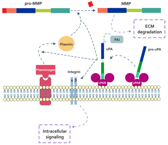 Function and regulation of a urokinase-type plasminogen activator (uPA) system. Plasmin cleaves pro-uPA generating active uPA, which, in turn, mediates the cleavage from the zymogen plasminogen to plasmin. Plasmin as well as uPA cleave pro-MMPs, generating activated MMPs, and promoting ECM degradation. In addition, uPA-urokinase-type plasminogen activator receptor (uPAR) binding interacts with integrins inducing different intracellular signaling pathways. On the other hand, plasminogen activator inhibitor (PAI) antagonizes uPA, inhibiting its activity, adapted from [56,57].