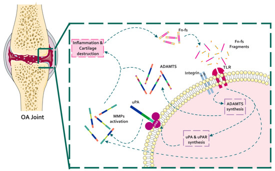Osteoarthritis (OA) is the most prevalent arthritic disease affecting the joints. While mainly related to aging, it is also associated with a diversity of risk factors including genetic predisposition, epigenetic factors, gender, obesity, exercise, work-related injury, and trauma. Irreversible and gradual loss of the articular cartilage remains the fundamental feature of OA pathophysiology [1,2,3,4]. However, in the course of the disease, all the joint tissues including synovium and bone undergo physical, functional, and metabolic alterations that comprise different cellular types as well as components of the extracellular cellular matrix (ECM). The ECM is a complex and specialized three-dimensional macromolecular network, present in nearly all tissues, which also interacts with cell surface receptors on joint resident cells. It is secreted, assembled, and modeled by the surrounding cells, providing physical support and organization to tissues. ECM is involved in many cell functions, providing cells with chemical and mechanical signals to regulate cell proliferation, survival, migration, and differentiation. However, changes in the composition and physical properties of the ECM lead to the development of many diseases, including cancer and rheumatic diseases, such as OA and rheumatoid arthritis (RA), among others [5,6]. Moreover, cell stress and ECM degradation promote maladaptive healing reactions, including inflammatory pathways of innate and adaptive immunity [7]. The loss of the biomechanical properties of cartilage induced by prior injuries or increased loading is the most significant feature in the initiation and progression of OA. Among the fibrillary components of ECM, the glycoprotein fibronectin (Fn) is an important member that acts as a bridging molecule in matrix assembly and cell–matrix interfaces. During the development of OA, tissue proteolysis and injury induce ECM degradation generating Fn fragments (Fn-fs), among other catabolic mediators, that promote inflammation and degradation by the induction of cytokine [8] and proteinase expressions [5]. This review focuses on the emerging issues related to the role of Fn-fs in the inflammatory cascade through the stimulation of urokinase-type plasminogen activator (uPA), matrix metalloproteinases (MMPs), and a disintegrin and metalloproteinase with thrombospondin motifs (ADAMTSs) proteinases in OA. The mechanisms underlying these proteinases are also discussed.