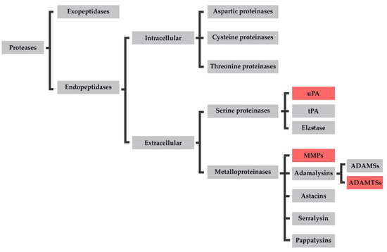 Classification of proteases. Families of proteases involved in osteoarthritis (OA) development are highlighted in red, adapted from [55,56].
