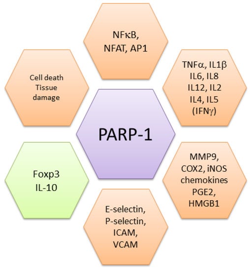 - Laudisi, F.; Sambucci, M.; Pioli, C. Poly (ADP-ribose) polymerase-1 (PARP-1) as immune regulator. Endocr. Metab. Immune Disord. Drug Targets 2011, 11, 326–333. [Google Scholar] [CrossRef]
