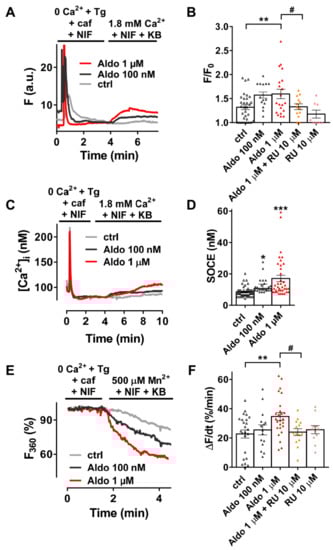 We firstly examined the SOCE activity in quiescent rod-shaped Fluo-4/AM-loaded ARVMs, which were treated with or without aldosterone (Aldo) for 24 h. Of interest, 24-h aldosterone treatment did not induce cellular hypertrophy as assessed by the similar membrane capacitance of isolated ARVMs treated 24 h with or without 1 μM aldosterone (123 ± 6 vs. 120 ± 6 pF, for 23 control cells vs. 23 Aldo treated cells, respectively). As exemplified in Figure 1A, after SR depletion in a Ca2+-free solution containing thapsigargin (a SERCA inhibitor, Tg 5 µM), caffeine (an RyR2 activator, caf 10 mM), and nifedipine (an L-type Ca2+ channel blocker, NIF 10 µM), the subsequent addition of 1.8 mM Ca2+ in the presence of NIF and KB-R7943 (an Na+–Ca2+ exchanger inhibitor, KB 5 µM) induced a moderate increase of fluorescence in 69% of ctrl ARVMs (gray trace), while a stronger response was observed in a dose-dependent manner in all aldosterone-treated cells (100 nM, dark-gray trace and 1 µM, red trace). On average (Figure 1B), we denoted a 1.4-fold increase in Ca2+ entry in 1 µM aldosterone-treated ARVMs, which was prevented in co-treated ARVMs with a selective mineralocorticoid receptor (MR) antagonist RU-28318 (RU at 10 µM). Similar results were obtained using the ratiometric Fura-2/AM fluorescent probe (Figure 1C,D). To confirm those results, we used Mn2+-quenching microfluorimetry in the presence of major cardiac Ca2+ entry pathway inhibitors (NIF and KB). Figure 1E shows representative Fura-2/AM fluorescence traces after SR depletion of ARVMs treated with or without aldosterone for 24 h. The quenching rates, proportional to Mn2+ entry, were increased up to 1.5-fold after aldosterone incubation; the effect was blunted in ARVMs co-treated with 10 μM RU-28318 (Figure 1F). These data confirmed an increased cation entry after aldosterone treatment, which was dependent on MR activation.
