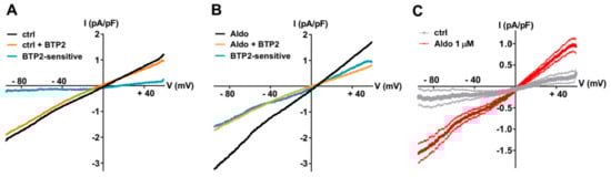 To further explore the nature of the SOCE modulated by the aldosterone pathway, we recorded the store-dependent currents using the patch-clamp technique in whole-cell configuration, using solutions to limit Ca2+ and K+ currents by including inhibitors (NIF and KB) and Cs+ to block K+ channels. After SR Ca2+ store depletion (see above), the SOC currents (ISOC) were elicited by a standard ramp protocol before and after the perfusion of the non-selective SOC channel blocker BTP2 (5 µM). As shown in Figure 2A–C, the small BTP2-sensitive currents with a linear current density–voltage relationship and a reversal potential around 0 mV were recorded in ARVMs incubated without aldosterone. The ISOC was increased in aldosterone-treated ARVMs (Figure 2C). The feature of this aldosterone-enhanced ISOC induced by store depletion, i.e., its reversal potential around 0 mV and sensitivity to BTP2, suggested the activation of non-selective cationic channels carried by TRPCs.