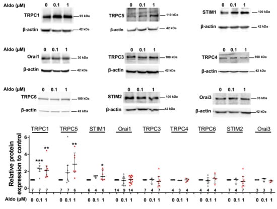 A 24-h aldosterone treatment increases transient receptor potential canonical channel 1 (TRPC1), TRPC5, and STIM1 protein expression in ARVMs. Representative Western blot (top panels) and pooled data (bottom bar graph) of TRPC1, TRPC5, STIM1, Orai1, TRPC3, TRPC4, TRPC6, STIM2, and Orai3 in ARVMs incubated for 24 h in the absence or in the presence of aldosterone (100 nM or 1 µM). Protein levels were normalized by β-actin and are expressed as fold changes of that determined in untreated ARVMs for each cell isolation. Results are presented as scatter plots with median and interquartile range. Statistical significance was evaluated using one-way ANOVA (Kruskal–Wallis) followed by post hoc Dunn’s test for multiple comparisons. * p < 0.05, ** p < 0.01, *** p < 0.001 vs. ctrl.