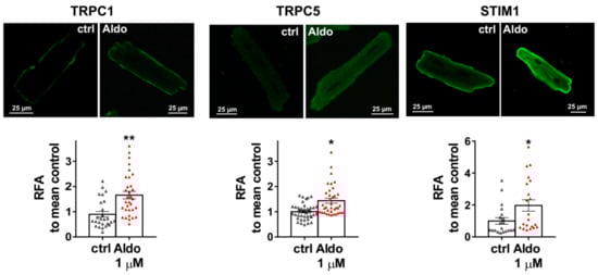 Cellular localization of TRPC1, TRPC5, and STIM1 in ARVMs. Representative immunofluorescences images (top) and quantification of TRPC1, TRPC5, and STIM1 in ARVMs incubated for 24 h in the absence or in the presence of aldosterone 1 µM. Results are expressed as relative fluorescence/cellular area (RFA). Average results of 20–39 cells from three isolations. Results are presented as scatter plots with mean ± SEM. Statistical significance was evaluated using Student’s t-test. * p < 0.05, ** p < 0.01 vs. ctrl.