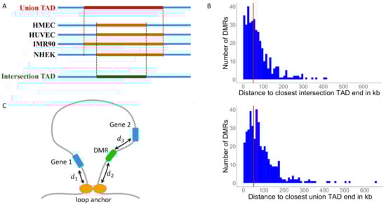 Loop domains are thought to affect gene regulation by bringing remote regulatory elements to the proximity of their targets if both reside inside the TAD and near the loop anchor. Therefore, we wanted to test if MH-derived DMRs inside a TAD are closer to the TAD boundary than expected by chance. For this, we defined a DMR residing up to 50 kb from a TAD boundary as proximal to the boundary, as enhancers are typically closer than 50 kb to their target []. Using a Monte Carlo simulation with 10,000 repetitions, we found that MH-derived DMRs are indeed much closer to TAD boundaries than expected by chance (p < 10−4, Table S3). A similar conclusion was obtained using a χ2-test on the expected value of the simulations (p = 1.2 × 10−54 and p = 1.4 × 10−58 for intersection- and union-TADs, respectively, Table S3). Together, these results suggest that MH-derived DMRs reside within 50 kb of a TAD boundary much more frequently than expected by chance (Figure 1B).