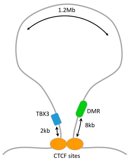 An illustration of TBX3 and its spatially associated DMR. The black arrows represent the distance between the DMR and a ChIA-PET validated CTCF binding site and TBX3 and a ChIA-PET validated CTCF binding site []. The linear distance between TBX3 and the DMR is 1.2 Mb.
