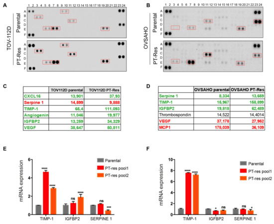 PT-resistant EOC cells express higher levels of TIMP-1. (A,B) Angiogenesis protein arrays showing cytokines expressed by parental (upper panels) and PT-res (lower panels) TOV-112D (A) and OVSAHO (B) pooled cells; boxed spots highlight differentially expressed cytokines. (C,D) Quantification expressed in arbitrary units of the protein spots of the experiments reported in (A) and (B), respectively; cytokines down-regulated in PT-res cells are highlighted in red and in green those up-regulated. (E,F) Graph reporting the qRT-PCR analyses of regulated cytokines of parental and PT-res (pool 1 and 2) TOV-112D (E) and OVSAHO cells (F); GAPDH was used as a normalizer gene; qPCR analyses were repeated six times. p-values were obtained using the ANOVA two-way test; **** p < 0.0001, *** p < 0.001; * p < 0.05, ns: not significant.