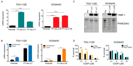 TIMP-1 expression is increased in EOC PT-res cells. (A) Graphs reporting the mRNA expression of TIMP-1 in TOV-112D and OVSAHO parental and PT-res clones evaluated by qRT-PCR. (B) Graphs reporting TIMP-1 mRNA expression in the indicated EOC parental and PT-res cells untreated or treated with CDDP (25 µM for TOV112D and 15 µM for OVSAHO) for 24 h determined by RT-PCR. In (A) and (B), mRNA levels were analyzed in duplicate and normalized to GAPDH housekeeping genes expression. (C) Western blot analyses of CM from the indicated parental and PT-res cells evaluating the expression of TIMP-1. The lower panels show the Ponceau staining of the nitrocellulose membranes to check the levels of protein input. (D) Graphs reporting cell viability of TOV-112D and OVSAHO parental cells treated for 16 h with increasing doses of CDDP in the presence or not of recombinant human TIMP-1 protein. Data report the percentage of viable cells with respect to the untreated cells and represent the mean (+SD) of three independent experiments. Statistical significance was determined by a two-tailed, unpaired Student’s t-test (* p < 0.05, ** p < 0.01, *** p < 0.001, **** p < 0.0001).
