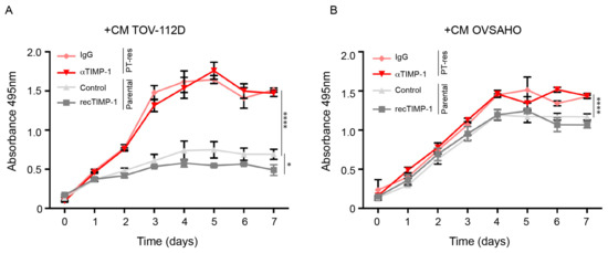 CM from PT-resistant EOC cells increased HUVEC proliferation independently of TIMP-1. (A,B) Cell viability of HUVEC cells challenged with CM from parental and PT-res TOV-112D cells (clone 7) (A) or parental and PT-resistant OVSAHO cells (clone 39) (B) in the presence (recTIMP1) or not (control) of recombinant TIMP-1 in parental cells and in the presence of a TIMP-1 blocking antibody (α-TIMP1) or goat-IgG (IgG) in PT-res cells. Absorbance was measured at 495 nm. Analyses were repeated three times. p-values were obtained using the ANOVA two-way test; **** p < 0.0001, * p < 0.05.