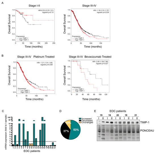 High TIMP-1 expression predicts poor prognosis in stage III–IV EOC patients. (A) Kaplan–Meier survival curves evaluating the overall survival (OS) of stage I–II (n = 135, left) and stage III–IV (n = 1220, right) patients with OC, based on the expression of TIMP-1 using the KM-plotter online tool. (B) Kaplan–Meier survival curves evaluating the OS of stage III–IV EOC patients treated with platinum (left, n = 1099) or with regimens containing bevacizumab (right, n = 47) stratified for TIMP-1 expression. In (A) and (B), p-values are reported in the plots; HR = hazard ratio and CI = confidence interval. (C) Graph reporting the quantification of qRT-PCR analysis of TIMP-1 circulating RNA (cRNA) expression in coupled plasma samples of EOC patients (n = 21). Data are expressed as fold of mRNA expression in patients’ plasma at the end of chemotherapy (II sample) over its expression at the baseline (I sample). (D) Pie chart summarizing the modification in TIMP-1 cRNA expression in sample II, with respect to sample I, in the plasma samples described in (C). (E) Representative Western blot analyses of TIMP-1 expression in plasma samples described in (C). Lower panel shows the Ponceau stain of the nitrocellulose membrane to check the levels of loaded proteins.