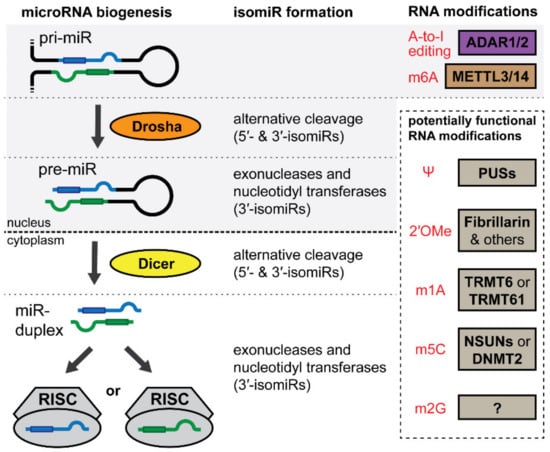 MicroRNA biogenesis and alterations that induce isomiR formation or microRNA nucleotide modifications. Transcription of the microRNA containing gene forms the primary microRNA (pri-miR). Drosha cleaves the pri-miR to generate the precursor microRNA (pre-miR). The pre-miR cleaved by Dicer in the cytoplasm yielding the microRNA duplex. Either side of the duplex can be incorporated into the RNA-induced silencing complex (RISC) to become a functional mature microRNA. IsomiRs can be formed during microRNA biogenesis when Drosha or Dicer cleave in alternative locations, or when exonucleases or nucleotidyl transferases remove or add nucleotides to the 3′-end of the pre-miR or the mature microRNA. RNA nucleotide modifications with known or potential functional implications on microRNA biogenesis or functioning are shown in red with their ‘writers’ next to them.