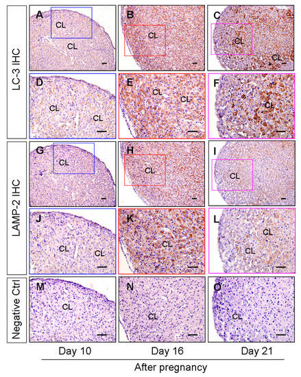Expression and localization of LC-3 and LAMP-2 during the luteal development in the ovaries of pregnant rats. LC-3 (A–F) and LAMP-2 (G–L) immunohistochemical signals appear brown, and the counterstaining background appears blue in color. Negative controls remained unstained, lacking a primary antibody instead of a serum (M–O). (A,D,G,J,M) are results on day 10 after pregnancy; (B,E,H,K,N) are results on day 16 after pregnancy; (C,F,I,L,O) are results on day 21 after pregnancy. CL: corpus luteum. Scale bar = 100 µm.