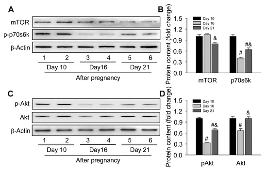 Expressions changes of Akt/mTOR signaling during the luteal development in ovaries of pregnant rats: (A) representative western blotting analyses depicting the protein levels of mTOR and p-p70s6k; (B) summarized intensities of mTOR and p-p70s6k blots normalized to the control; (C) representative western blotting analyses depicting the protein levels of p-Akt and Akt; (D) summarized intensities of p-Akt and Akt blots normalized to the control. Each value represents the mean ± SE, n = 6. ANOVA was used to analyze the data. #: p < 0.05 vs. p on day 10, &: p < 0.05 vs. p on day 16.