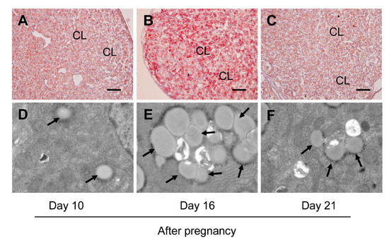 Changes of the storage of lipid droplets in ovaries during the luteal development of pregnant rats: (A–C) the storage of lipid droplets in CLs on days 10, 16, and 21 of pregnancy by Oil Red O staining, respectively; (D–F) the storage of lipid droplets in CLs on days 10, 16, and 21 of pregnancy by TEM observation, respectively. The arrows pointed to lipid droplets. CL: corpus luteum. Scale bar = 100 μm.