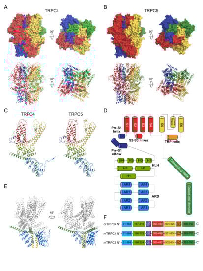 General architecture of the TRPC4 and TRPC5 channels. (A,B) Tetrameric structures of the channels. Upper panel: surface map of the channels; Lower panel: cartoon diagram of the channels. (C) Monomers of each channel. The colors of each domain correspond to the domain diagram in (D,F). (D) Domain diagram of TRPC4 and 5 channels. From the N-terminal cytoplasmic domain to the C-terminal cytoplasmic domain, ARD, HLH, Pre-S1 elbow, Pre-S1 helix, VSLD, S5, S5-S6 linker, pore helix, S6, TRP helix, connecting helix, and the coiled-coil domain are shown. (E) Relationship between ARD and the connecting helix. Blue domains: ARD; Green domains: connecting-helix; Yellow domains: coiled-coil domains. (F) Amino-acid numbers corresponding to each domain.