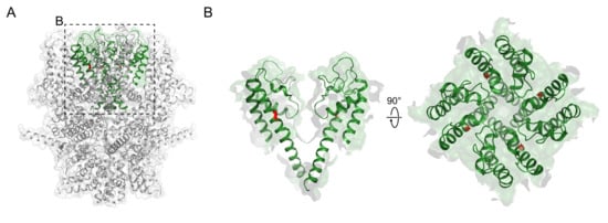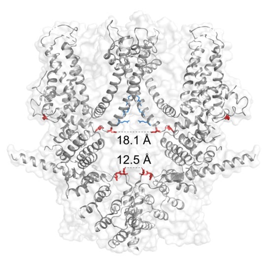 - Dosey, T.L.; Wang, Z.; Fan, G.; Zhang, Z.; Serysheva, I.I.; Chiu, W.; Wensel, T.G. Structures of TRPV2 in distinct conformations provide insight into role of the pore turret. Nat. Struct. Mol. Biol. 2019, 26, 40–49. [Google Scholar] [CrossRef]