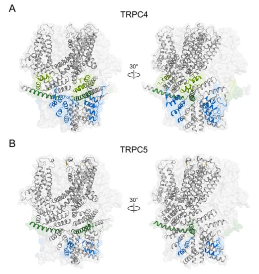 Domains responsible for tetramerization process in TRPC4 and TRPC5 channels. (A) Domains in TRPC4 channels. Blue domains: ARD; Light green domains: HLH; Green domains: connecting helix. (B) Domains in TRPC5 channels. Blue domains: ARD; Green domains: connecting-helix.