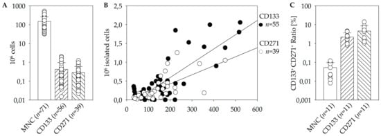 First, we were able to achieve suitable isolation protocols and storage parameters. The results from the manual immuno-magnetic cell separation in combination with flow cytometric analysis revealed relatively few CD133+ and CD271+ cells within BM. Moreover, a linear dependence between target stem cells and the initial amount of MNC has been found (Figure 1B). However, the initial cell numbers and percentages differed eminently within the patient’s cohort [17,18].