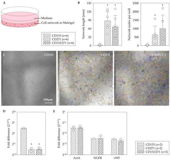 In vitro angiogenesis assay. Schematic illustration of the network formation assay within the Matrigel for testing of the angiogenesis potential (A). In contrast to CD133+ cells, a significant formation of network length and highest number of nodal points in the network of CD271+ cells as well as CD133+/CD271+ cell co-culture were observed (B). Representative phase contrast z-stack images of the mono- and co-culture assays (C). CD133+ cell culture in Matrigel led to a 10-fold higher level of ActA gene in comparison to CD133+/271+ cell co-culture (D). No differences were observed between CD271+ and CD133+/271+ cell culture assays for ActA, NGFR, and vWF gene expression (E). Mean ± SD; * p ≤ 0.015 vs. CD133, Mann–Whitney U test.