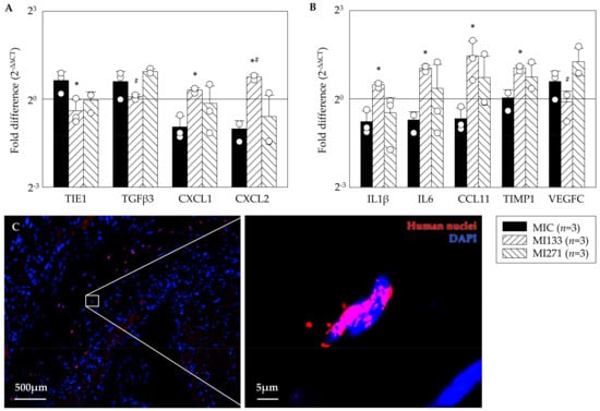 Currently, animal experiments are necessary to evaluate the effects of stem cell therapies on the infarcted hearts. The complex pathophysiological processes have to be taken into account, as the intact circulation, vegetative nervous system, and cellular interactions of the entire organism are essential to guarantee reliable scientific results. By the use of a small animal model, applied stem cells were investigated regarding their capability to differentiate as well as which gene expression patterns were associated. For quantitative assessment of the angiogenic benefit we performed Real-Time-PCR assays using the RT² Profiler PCR Array Mouse Angiogenesis® kit. The ΔΔCT method was used to calculate fold-differences in target gens compared to the SHAM operation. Following CD133+ cell treatment (MI133) we observed a significant lower expression of the inflammatory cytokine TIE1 (Tyrosine kinase with immunoglobulin-like and EGF-like domains) and fibrotic marker TGFβ3 and a significant improvement of the pro-angiogenic factors such as CXCL1 and CXCL2 compared to MIC as well as MI271 group (Figure 4A). After CD271+ cell treatment we found a lower expression of the inflammatory cytokines IL1β, IL6, CCL11, and TIMP1 in contrast to a significant increase after CD133+ stem cell treatment versus MIC and the angiogenic factor VEGFC (vascular endothelial growth factor) was significantly improved compared to MI133 (Figure 4B). We were able to find the transplanted human cells 48 h after transplantation at the border of the infarct (Figure 4C).