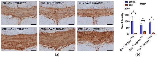 - Xia, M.; Chen, W.; Wang, J.; Yin, Y.; Guo, C.; Li, C.; Li, M.; Tang, X.; Jia, Z.; Hu, R.; et al. TRPA1 Activation-Induced Myelin Degradation Plays a Key Role in Motor Dysfunction After Intracerebral Hemorrhage. Front. Mol. Neurosci. 2019, 12. [Google Scholar] [CrossRef]