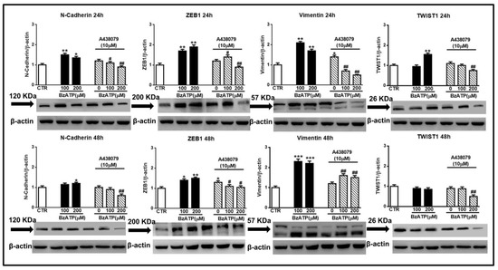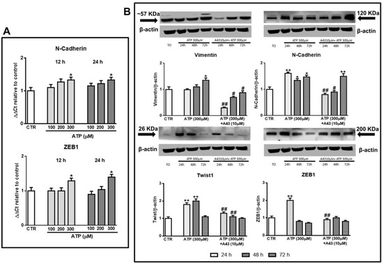 We started our study performing pivotal experiments in which we exposed GSC cultures to ATP, the natural ligand for most subtypes of the purinergic P2R family. The selected ATP concentrations (100, 200, and 300 μM) were administered only once to the cultures and were lower than that (500 μM) able to cause a definite cytotoxicity to the cells [24]. In this condition, only the highest ATP concentration was able to increase the expression of some EMT markers, as evaluated by real time PCR (N-cadherin and ZEB1) at 12 and 24 h or by western blot analysis (N-cadherin, ZEB1 and also vimentin and Twist1) within 72 h. In particular, ATP enhanced the protein content of vimentin and N-cadherin up to 72 h, whereas the increase of Twist1 or ZEB1 proteins lasted 48 h or 24h, respectively (Figure 1A,B). Cell pretreatment with the P2X7R antagonist A438079 reduced ATP-induced effects, except that on N-cadherin at 72 h.